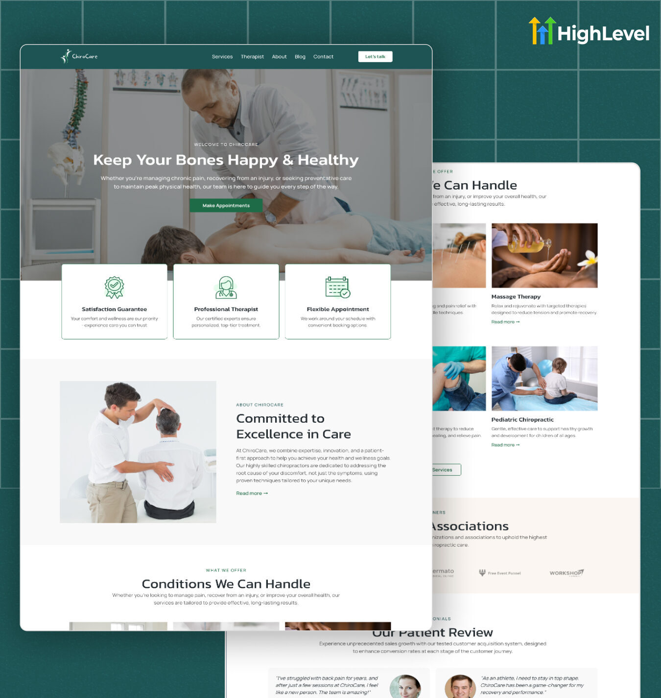The ChiroCare Website Template is a professionally designed, GoHighLevel website template built specifically for chiropractors, wellness clinics, and related healthcare providers. With 12 customizable pages, this template allows you to effortlessly create a polished online presence tailored to your practice. It’s user-friendly, visually appealing, and optimized for patient engagement, making it the ideal solution for showcasing your services, building trust, and driving appointments with ease.